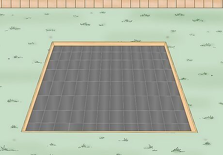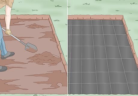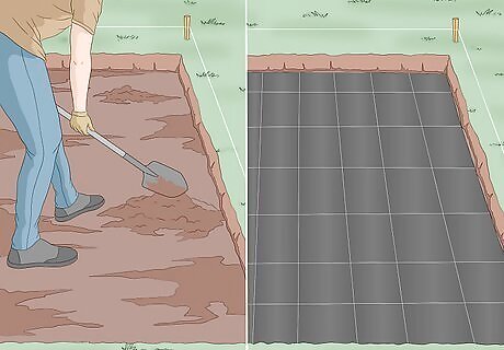Excavate the ground to create a hole that is three inches deep. Once you have dug this shallow hole, lay weed protection fabric in the bottom to keep any weeds from growing up under your shed.