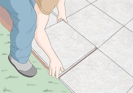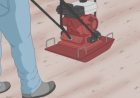 Measure the depth of your paving slabs. Your paving slabs should be slightly higher than ground level when they are placed in your hole. Fill about half of the hole with concrete. Use a rake to level off the concrete. Once the concrete has set, cover the area with paving slabs.