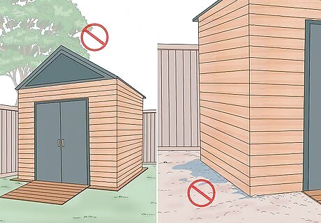 Find a spot that will allow you to access all sides of your shed. You will need to be able to access every side of your shed so that you can make repairs and maintain it throughout the year. You should also consider the roof of your shed; tree branches can rub away roof felt. When picking your spot, try to avoid: Putting your shed too close to walls or fences. You should be able to walk all the way around your shed. Putting your shed too close to trees or shrubs that will need pruning. As mentioned above, tree branches can damage the roof of your shed. Putting your shed on a boggy patch of ground. The ground should be fairly dry underneath your shed to keep it from sinking into the earth.