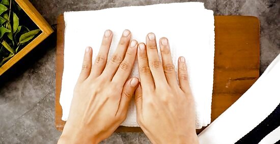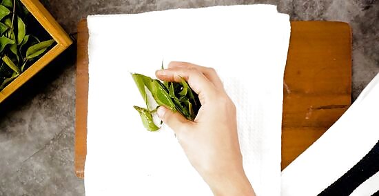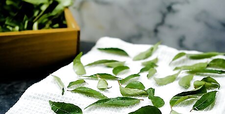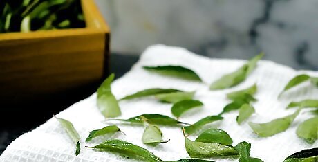 Rinse your curry leaves in cool water and dry them with a cloth. Run cool water over all of your curry leaves to remove any dirt or debris that may be on them. Hold the leaves in your hand or set them in a strainer to make sure none get washed into your sink. Pat your curry leaves dry with a clean towel or cloth. Remove as much excess water as you can so that your leaves dry faster.