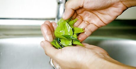 Rinse the leaves in cool water. Gently wash your curry leaves to remove and dirt that might be on them. Set your leaves in a strainer or a bowl and run cool water over the leaves to wash them all. Try not to wash any down your drain or into your sink. If your curry leaves have stems on them, remove those before you wash them.