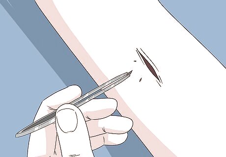 Remove any dirt or debris with tweezers. Dip the tips of the tweezers in rubbing alcohol to sterilize them, then wait for them to dry. Once they're dry, carefully pull out any dirt or other material that has lodged into the cut and won't come out on its own. Be careful not to dig into your skin with the tweezers or make the cut bigger in the process. If there's anything stuck in the cut that you can't get out, seek medical attention rather than trying to do it yourself.