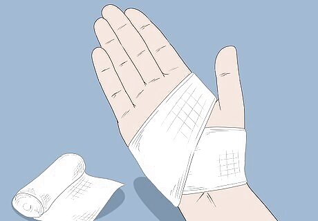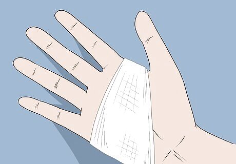 Cover the cut completely with a bandage or gauze. Covering the cut protects it from dirt and bacteria that could lead to infection. The bandage should completely cover the cut and the skin immediately surrounding it. If you're using gauze, cut a piece large enough to cover the wound and secure it with medical tape. If the cut is on an arm or leg, you can also wrap the gauze around the limb and then secure the end. Make sure there is no adhesive touching the cut itself. If you're using an adhesive bandage, make sure the cut is completely covered by the pad. Even though you've washed your hands, don't touch the part of the bandage that rests directly on the cut.