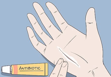 Dab on a thin layer of antibiotic ointment with your finger. If you don't have antibiotic ointment, petroleum jelly will also work. However, the antibiotic ointment kills any bacteria that might remain in the cut and better prevents infection. You can also use a clean lint-free cloth or piece of gauze to apply the ointment if you don't want to get it on your finger. However, don't use facial tissue or a cotton ball — they could leave fibers in the cut. Wash your hands and dry them after applying the antibiotic ointment.