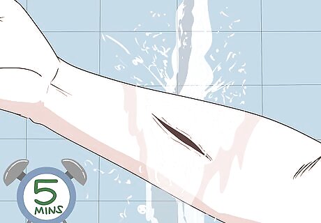 Rinse the cut under running tap water for 5 minutes. Once the cut has stopped bleeding, hold it under a running tap of cool water. If the cut is in a place you can't easily get under a tap, fill a cup with water and pour it over the cut. Refill and continue the process for about 5 minutes. Don't scratch or rub the skin around the cut or try to pull apart the cut. If the cut appears deep, or if it starts bleeding again when you run water over it, stop rinsing it out. Apply pressure with a clean, dry cloth or piece of gauze and seek medical attention.