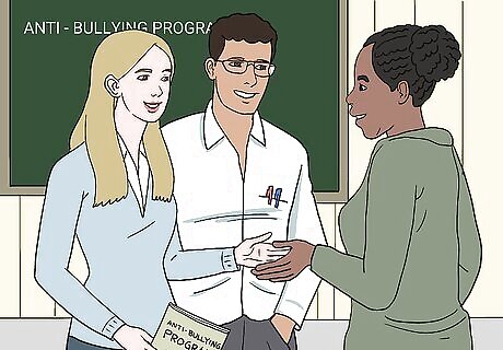 Create an anti-bullying program at your school if you don’t have one. Anti-bullying programs educate kids about bullying and teach them how to stop it. Partner with students, parents, and other teachers to create a program for your school. Then, plan activities for your program. Here are some you might try: Host workshops about bullying. Invite a guest speaker to talk to the students about bullying. Ask students to make signs about bullying to hang around the school. Educate parents about bullying and what to watch for.