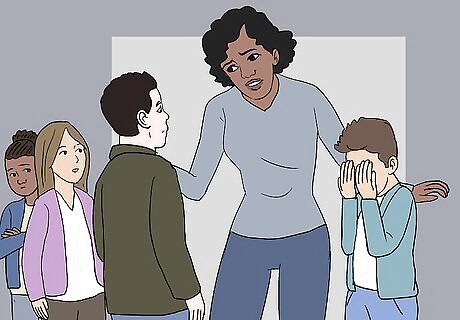 Address bullying behavior as soon as it occurs. You’ll likely feel really upset if you see your students bullying another student. If this happens, stay calm and intervene immediately. Get between the students and remind them of your school’s rules about bullying. Then, separate the students and talk to them separately. You might get between the students and say, "Stop! We all need to calm down now!" or "Everyone to the counselor's office now!" Ask other adults to help if that’s possible. Don’t ask about what happened while all of the kids are together, as this might cause more conflict or hurt feelings. If you haven’t witnessed bullying but suspect a student is being bullied, pull that student aside and talk to them privately.