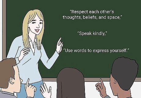 Ask your students to help you set positive expectations about bullying. Kids and teens are more likely to follow the rules if they help set them. Talk to your students about the kind of classroom they want, and how they think they should act in class. Then, create 3-5 positive classroom expectations that your students agree to meet. For younger students, say something like, “I want you guys to feel safe and happy here. How do you want your classmates to treat you?” For younger kids, classroom expectations might include, “Be nice,” “Take turns,” and “Use kind words.” If you have older students, you might say, “I want our classroom to be a safe, productive space. What kind of rules do you guys think could help us achieve that?” For older students, your expectations might include, “Respect each other’s thoughts, beliefs, and space,” “Speak kindly,” and “Use words to express yourself.”