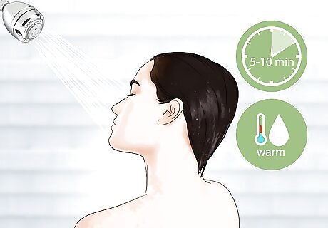 Take shorter showers with warm water. Limit your time in the bath or shower to about 5 or 10 minutes and use warm water instead of hot water, which can dry out your skin. Close the bathroom door before you get in to keep moisture inside the room while you’re getting dressed.
