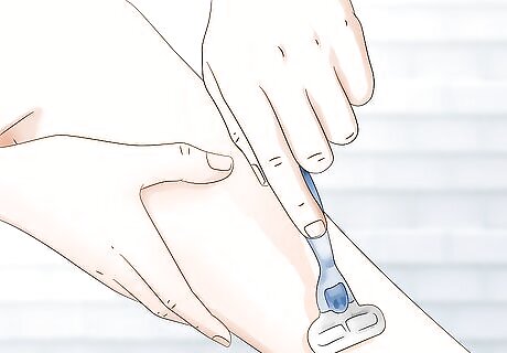 Shave once your skin has been warmed and softened in the shower. Only shave after the hairs and your skin have been softened by the warm water. Use a shaving cream that says “hypoallergenic” or “sensitive skin” on the packaging. For thicker hairs on your face and groin area, shave in the same direction that the hair grows to prevent razor burn. Keep your razor in a dry place (not the shower or sink) to prevent the growth of bacteria and to keep it from rusting. Apply a gentle oil (like baby oil) to your skin before applying shaving cream for added moisture and an extra-silky feeling after shaving. For shaving your face, wash it with warm water first and pat it dry before applying shaving cream.