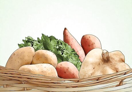 Eat root vegetables, greens, soy, and broths rich in hyaluronic acid. Hyaluronic acid can be applied topically in a cream or absorbed from the foods that you eat. This special molecule attracts and retains moisture on the outer layers of your skin. Other foods rich in this molecule include soy products (tofu, edamame, tempeh), potatoes, sweet potatoes, jicama, tubers, olives, leafy greens, and beef and bone broths. Try making a skin-hydrating stew using as many of these ingredients as you like, including 1 tablespoon (3.0 tsp) of olive oil for healthy, skin-nourishing fat.