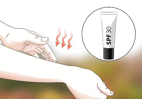 Protect your skin from the sun’s UV rays. Protect your skin from the sun’s moisture-stripping heat with full-spectrum (UVA and UVB protective) sunscreen. Apply a quarter-sized amount of SPF 30 (and up) to each exposed section of your body every morning, midday, and afternoon if you know you’ll be outside. Apply it about 15 before sun exposure so the lotion can soak into your skin. Use it every day, even in the winter or if it’s only partly sunny. If you’re going outside in a swimsuit, you’ll need to apply about 1 fluid ounce (2.0 US tbsp) of sunscreen to cover your entire body. Reapply sunscreen every 2 hours or immediately after swimming or sweating. During extremely hot, sunny months, cover up with thin, light-colored clothing and hats that will keep you cool and protected.