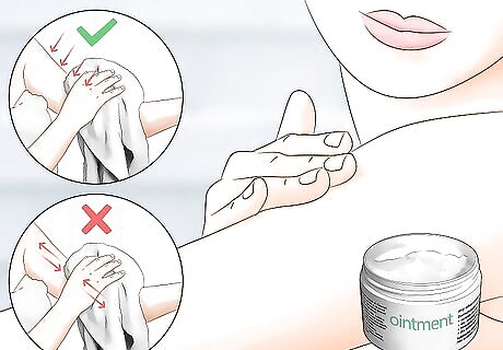 Blot your skin damp and apply moisturizer immediately after showering. Rubbing your skin might irritate the surface layer. Instead, blot your skin until it’s relatively dry (but still a little damp) to give the water a chance to soak into your skin. Slather on cream or ointment immediately after blotting to lock in moisture. Use soft towels instead of starchy ones that can cause irritation. Opt for creams and ointments rather than lotions. Creams and ointment are more effective for moisturizing dry skin. Tip: If you suffer from dry skin on your hands or feet, slather them in a thick layer of ointment or cream before you go to bed and then put on a pair of gloves or socks. When you wake up, remove the gloves or socks and wipe away the excess to reveal baby-soft skin.
