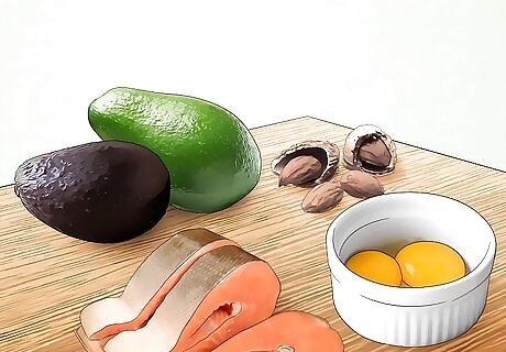 Enjoy 2 or 3 servings of healthy fats every day. Healthy fats that contain omega 3 and omega 6 fatty acids will boost your collagen production, sending moisture to your skin and keeping it there. Choose monounsaturated fats like avocado, olive oil, nuts, and nut butters. Chia seeds, walnuts, flaxseeds, fatty fish (like wild salmon or halibut) and egg yolks contain lots of omega 3’s. Talk to your doctor about balancing your intake of omega 3 and omega 6 fatty acids as too much of any one can cause health issues.