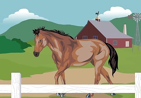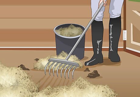 Muck your horse’s stall every day. Mucking a horse stall involves removing feces and replacing the bedding. A pitchfork is useful for cleaning out the stall. If anything falls through the slats of the pitchfork, pick it up with a shovel. Damp spots on the stall floor indicate urine—clean up these spots with an absorbent deodorizer to remove the irritating smell of ammonia. If you don’t see damp spots right away, inspect the entire stall for the scent of ammonia. Consider putting your head where your horse’s head would go. You may be surprised where you end up smelling ammonia.