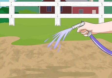 Moisten the arena footing. If you have an arena, your horse could kick up a lot of particles when exercising and training in the arena. If the arena footing is made of sand, dampen the sand to prevent it from flying into the air. Alternatively, you could reduce dust by adding a special coated sand on top of the sand footing.