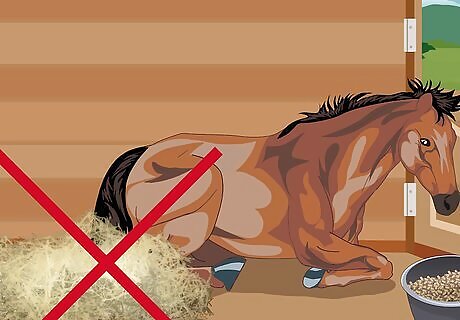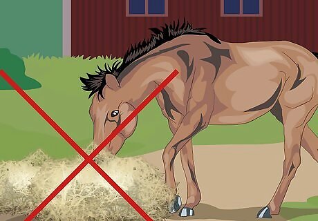 Do not feed your horse hay. Hay has a lot of dust and is a common culprit of heaves in horses. If you want to prevent heaves in your horse, take hay out of his diet, particularly round bale hay. Compared with other types of forage, round bale hay has higher amounts of dust, mold, and other allergens. A horse will bury his nose in the bale and breathe in those allergens. Even good-quality hay contains dust. If you decide to feed your horse hay, soak it in water for up to 30 minutes to decrease its dust levels. Throw away any uneaten soaked hay, since it could develop mold when it dries out. Rolled grains can also be dusty, so do not feed these to your horse.