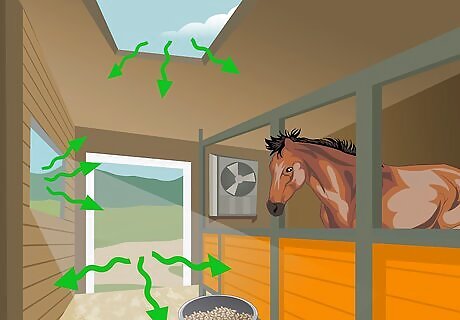 Increase air flow in your horse’s stable. Adequate ventilation is essential to lowering the allergen count in your horse’s stable. An easy way to improve ventilation is to keep the stable windows and doors open as much as possible, even in cold weather. If your horse gets cold, put a well-fitting blanket over him. Other ventilation strategies are available: Strategically place fans in the stable so they recirculate the air but do not blow dust particles back into the air. It may take some trial and error to determine where to place the fans. Install vents or windows in the roof so warm air can escape. Consider installing ridge vents, which run the length of a roof. If you are not comfortable doing the ventilation work yourself, work with a professional builder to improve the stable’s ventilation.