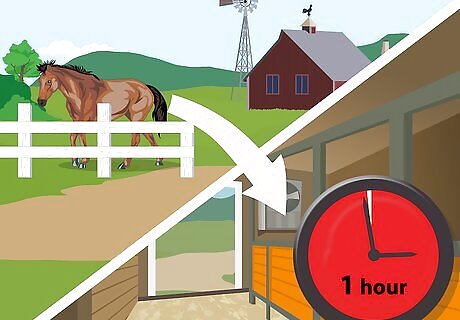 Wait for at least an hour to bring your horse back in. Cleaning your horse’s stable, even with dampening the floor before sweeping, can put a lot of dust in the air. In fact, the cleaning process can increase the amount of airborne dust to 16 times above normal! It will take about an hour for all of the dust to settle back down to the floor, so keep your horse out on pasture for at least an hour after you’ve finished cleaning.