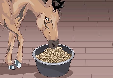 Give your horse a complete pelleted feed in the winter. In winter, there won’t be much grass for your horse to eat. A commercially available pelleted feed is low in dust, which will help prevent heaves. Your vet can recommend which pelleted feed to give your horse. A low-dust diet is important for preventing heaves. The term 'complete' indicates the feed contains all the required nutrients in the proper amounts. In the warmer months, you could also supplement the grass with the pelleted feed if your horse isn’t getting enough calories from pasture alone.