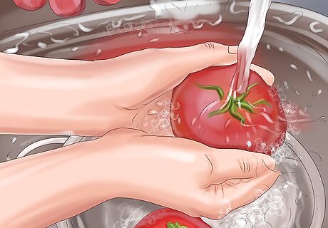 Wash fruits and vegetables thoroughly. Run the fruits and vegetables under water, rubbing them as you do. If you you're using root vegetables or firm produce like melons or cucumbers, make sure to scrub them with a brush. Even if you're peeling your fruits or vegetables, you should still rinse them. When you use a knife to cut into them, you're pushing the parasite into the fruit or veggies. Dry them off with a paper towel or clean dish towel, as that can also remove some bacteria and parasites.