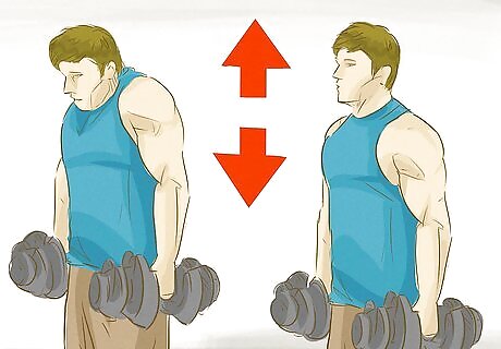 Try a weighted shrug. Hold weights in your hands while standing. Your arms should be at your side, palms facing forward, with the weights against your upper legs. Lift both shoulders up in a shrug, and then release. Repeat 20 times.