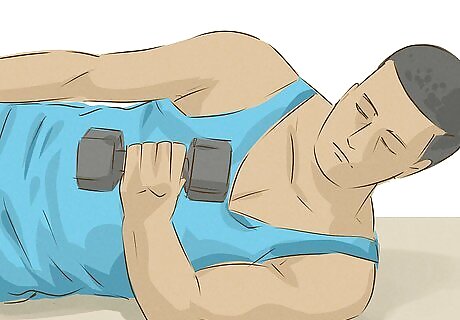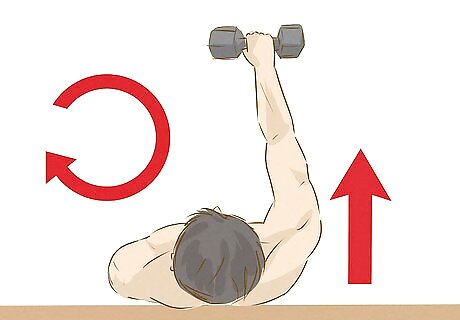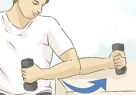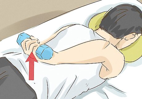 Do rotational exercises with dumbbells. Lie down on your side on a bench. Place a dumbbell in the arm that you're lying on, which should be bent at the elbow at a right angle. Lift the dumbbell up to your chest, rotating your arm inward. Repeat 20 times. Switch to the other arm, starting with the dumbbell at your chest. Keep your upper arm against your side while you rotate your forearm and lift the dumbbell upwards. Repeat 20 times. Move to the other side and repeat the whole process. You can use filled water bottles or cans of food in place of dumbbells.