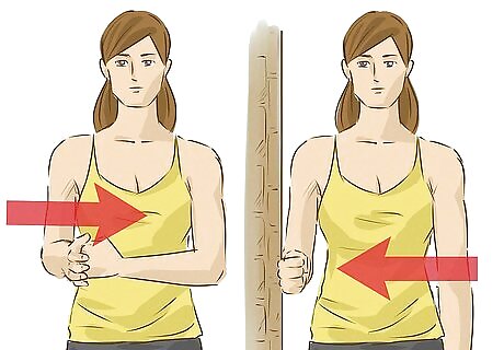 Press inward and outward with your arm to strengthen your rotator cuff. With your elbow at a 90-degree angle, your upper arm against your body, and your other hand directly in front of you, press inward against your other hand. Hold for 5 seconds. With your arm in the same 90-degree angle, press outward against a wall or other solid surface for 5 seconds. Do this 20 times apiece, then repeat with the other arm. This exercise, along with using a resistance band and doing rotations with dumbbells (both described in this section), help strengthen the rotator cuff. Strengthening the muscles around your shoulder can reduce the likelihood of dislocating your shoulder. Repeat all these exercises up to 5 times a day.