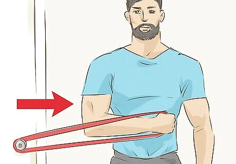 Use a resistance band to exercise your rotator cuff. Attach a resistance band to a solid object, like the knob of a closed door. Stand with your side facing the band, the elbow closest to the door at a 90-degree angle, and that upper arm against your body. Pull the band inward toward the center of your body for 5 seconds, but keep your upper arm secure against your ribs. Repeat this 20 times, then turn around and switch to the other arm. After that, attach a longer resistance band to the solid object -- or, if necessary, hold a shorter band securely in the hand you're not exercising with. Stand in the same position as before. This time, however, grab the band with your arm that's furthest from the doorknob. Pull outward while keeping your upper arm against your ribs, repeat 20 times, and switch arms.