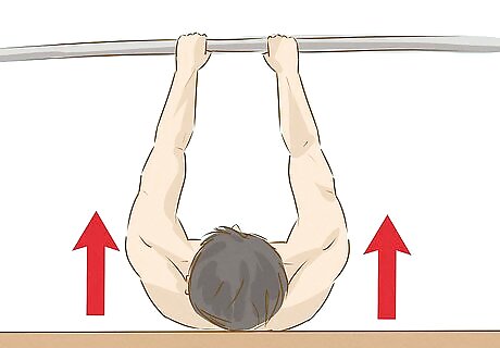 Start with a bar exercise for your scapular muscles. You can use a very light bar at first, or even a cane or broomstick. Lie down on your back, and hold the bar just over your upper chest with your fists close together (or even touching). Lift the bar upward until your arms extend fully. Lift your shoulder blades up and lower them back down. Then, lower your arms back down. Repeat 20 times. By lifting your shoulder blades, you're working to develop your scapular muscles. These muscles help balance the ball in the socket of your shoulder joint. That means strengthening them is also essential for keeping your shoulder from dislocating.