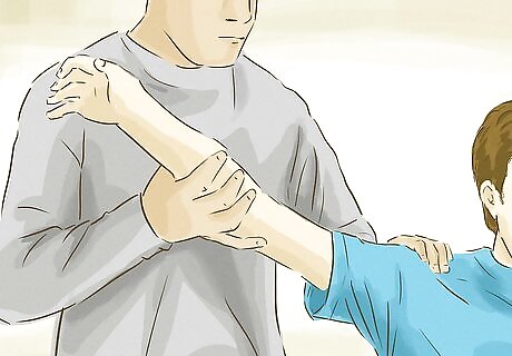 Visit a physical therapist. One part of recovery will be learning range-of-motion exercises to gently stretch your shoulder. These exercises will help you get mobility back in your shoulder, and they are specifically designed to keep you from re-injuring your shoulder. However, you should always do them under the direction of a physical therapist to help prevent re-injury. You'll likely do exercises like the pendulum exercise, where you lay the top half of your body on a table propped on the non-injured arm. Hang the arm of the injured shoulder straight down off the table. Swing the arm clockwise and counter-clockwise, and then like a pendulum forward and back. You should visit a physical therapist even before you're out of the sling. They can help you perform range-of-motion exercises for you elbow, hand, and wrist.