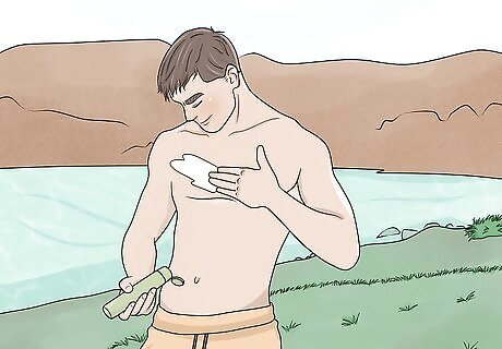 Apply waterproof sunblock to all your exposed skin. Swimmer's itch usually only affects areas not covered by your bathing suit. A gel barrier makes it difficult for the swimmer’s itch parasites to attach to your skin. Covering all your exposed skin with sunblock or a similar waterproof gel greatly reduces your risk of swimmer’s itch. Another type of waterproof gel substance will also work, like petroleum jelly.