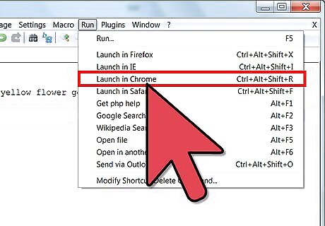 Test the HTML file in a Web browser. Open the webpage in a web browser. Go to “Run” on the top menu bar. Click it and select “Launch in Chrome” or any browser being installed in your system. Google Chrome is used for the testing in this article. You may have some other browsers installed within Notepad++. You can select your favorite browser. Another option, you can click the WampServer icon at the taskbars at the bottom of the screen and select “Localhost.” You should see your directory there and click the index file.