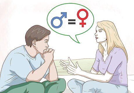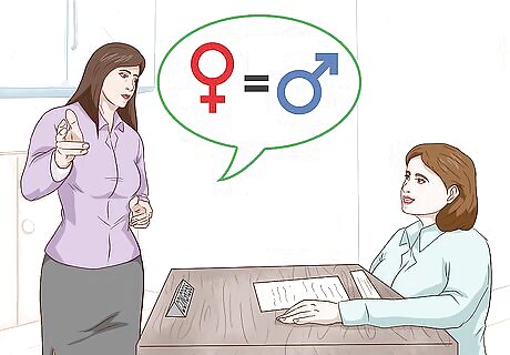 Educate others about gender equality. You can share what you’ve learned with others. This doesn’t mean you should go around lecturing everyone you meet, but you can definitely correct misconceptions. For example, if someone at work says they don’t believe that the wage gap is true, you could say, “Actually, it is true that statistically women are paid less than men. Here, let me show you this interesting article I read on the subject.” Make sure not to dominate the conversation. Other people might have helpful information to share, too. Be ready to listen.