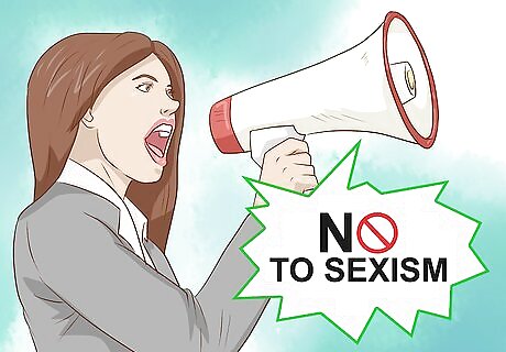 Speak up if you witness sexism. You likely witness examples of sexism every day. It could be in the form of gender stereotypes, inappropriate comments, or unwanted advances. If you see something that seems off, it probably is. Don’t be afraid to speak up. Maybe you've seen one of your friends put down a female sports reporter. Speak up and say, "Women are just as qualified as men to talk about baseball." You might feel objectified if someone on the street catcalls you. You have the right to say, "Stop!" For example, if you are at a bar and a patron keeps touching a female server, you could say, “Excuse me, she’s trying to do her job. Let’s keep things professional.” Be aware of safety. If the person seems volatile, don't confront them. Your safety is the most important thing.