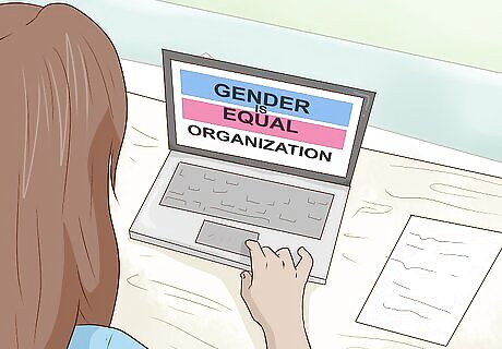 Research different organizations that focus on supporting gender equality. There are many ways that you can make a difference in your community, but don't forget that this is a global issue. Take some time to look for organizations whose mission you agree with before supporting them. You can start with a simple Google search. Read the “About” section on websites, and take a look at what the organization stands for. Maybe you've heard about the Time's Up movement. Check out their website to see exactly how their legal defense fund will help people dealing with sexual harassment, abuse, or inequality in the workplace. You can broaden your search to look for organizations that work on more specific issues. You could look for an organization that helps victims of domestic violence, for example.
