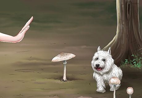 Direct dogs away from mushrooms. When taking your dog for a walk, don't let it get too close to wild mushrooms. Your dog may pull and be insistent about wanting to sniff, or chomp, a mushroom, but you should be firm and resolute about keeping it away. Most mushrooms you will come into contact with will not be poisonous. In fact, ninety nine percent are not toxic. However, one percent are and those will make your dog very ill, or even kill it. Don't assume that your dog will know the difference between edible and toxic mushrooms. There are some toxic mushrooms that are especially attractive to dogs, as they smell "fishy."