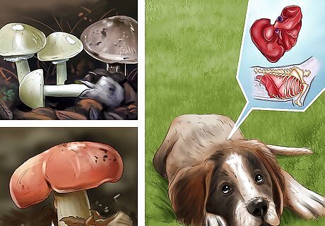 Learn about different strains of mushrooms. If you are interested in mushrooms and want to keep your dog away from toxic ones, spend some time studying different types of mushrooms and their properties. If you become a skilled mushroom expert, you will be able to protect your dog more effectively from mushrooms. To begin with, there are four main types of mushrooms that cause distinct issues. These include: Hepatotoxic: This category includes death cap mushrooms and they usually cause liver failure within six to twelve hours and death between one to two days. This type of mushroom is especially dangerous because the symptoms are delayed, so a dog owner may think that everything is alright when it is not. Neurotoxic: These mushrooms will rapidly cause neurological problems, such as seizures, weakness, hallucinations, lethargy, and tremors. Additionally, they cause gastrointestinal problems. Gastrointestinal: There are many types of mushrooms that will give your dog intestinal and digestive problems. These symptoms will usually come on very rapidly, sometimes as quick as fifteen minutes after eating the mushroom. Nephrotoxic: The toxicity of these mushrooms in dogs is up for debate. However, they are said to cause symptoms such as nausea, vomiting, and dehydration long after ingestion, usually after about twelve hours.