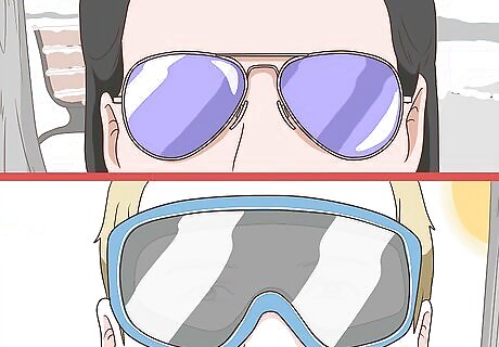 Wear eye protection. Even on cloudy days, exposure to harmful ultraviolet radiation can be high. To prevent damaging your eyes, wear sunglasses or goggles when outside during the winter. Goggles are best when snowboarding, snowmobiling, skiing, or engaging in other high-speed winter activities. Ask your optometrist to recommend goggles based on the specific winter activity (or activities) that you engage in, as they might be able to recommend goggles designed for a particular use. Regular sunglasses are best when skating, shoveling snow, or just walking about during winter. Choose wraparound frames to more fully protect your eye. Only wear eye protection that has been rated at least 99% UV-absorbent.