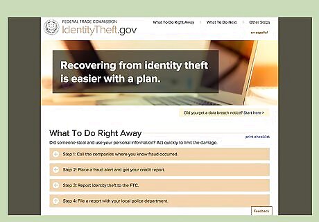 File a complaint with the Federal Trade Commission (FTC). You should report your theft to the FTC. You can do so by visiting the FTC Complaint Assistant and selecting “Identity Theft” under “Select a Category.” You can then choose your sub-category: Identity Theft, Attempted Identity Theft, Data Breach, or Lost Wallet or Purse. Answer the Complaint Assistant's questions. If you need to chat with a tech specialist, you can click on the icon in the upper-right corner. Someone is available Monday through Friday, 9:00 am to 8:00 pm Eastern Standard Time. Once you answer the questions, you should be given an Identity Theft Affidavit. Save this and print it off. You can also complain to the FTC by phone. Call 1-877-438-4338 to make your report.