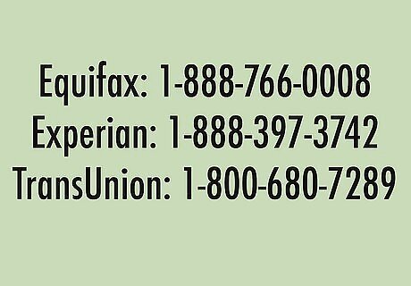 Request a fraud alert. Fraud alerts allow creditors access to your credit history provided they verify your identity. However, whenever a request is made, the business must call you to verify whether you are the one requesting the creation of an account. Each credit reporting agency will put a fraud alert in place for free. If you have had your wallet or purse stolen, then you should get fraud alerts in place. A fraud alert can be in place for 90 days or can be extended for seven years. Active military personnel can get fraud alerts in place for one year. To place the fraud alert, contact each credit reporting agency at the following number: Equifax: 1-888-766-0008 Experian: 1-888-397-3742 TransUnion: 1-800-680-7289