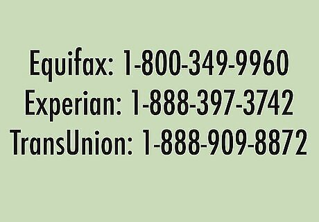 Put a credit freeze on your credit report. If you are particularly worried about identity theft, then you can ask to have a credit freeze put on your credit report. A credit freeze provides more protection than a fraud alert. With the freeze, third parties cannot gain access to your report. Because most lenders want to see your credit history before opening a credit card or extending a loan, the credit freeze will prevent a thief from opening an account in your name. To request a freeze, you will need to provide each credit reporting agency with your name, address, date of birth, Social Security Number, and other personal information. You should expect to pay a fee of around $5-10. The numbers to call for each credit reporting agency are: Equifax: 1-800-349-9960 Experian: 1-888-397-3742 TransUnion: 1-888-909-8872 After requesting the freeze, each credit reporting agency will send you a confirmation letter and a personal identification number (PIN) or password. You will need the PIN or password in order to lift the freeze. Keep it in a secured location.