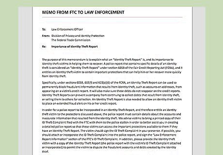 File a report with your police department. You should go to your local police department and request to make a report of identity theft. When you finish, you should get a copy of your police report. Take the following to the police department: any proof of the identity theft, such as bills, statements, IRS notices, etc. a valid photo identification issued by the government a copy of your FTC Identity Theft Affidavit proof of your address the FTC's Memo to Law Enforcement available for download at http://www.consumer.ftc.gov/sites/default/files/articles/pdf/pdf-0088-ftc-memo-law-enforcement.pdf.