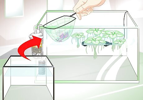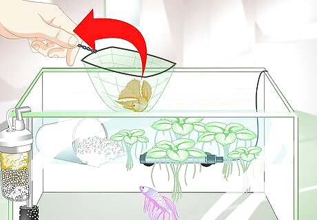 Move the male to the breeding tank. After you introduce your bettas in separate tanks, place the male in the breeding tank. Don’t allow him to see the female for a while to help prepare him to breed. Give the male a few hours to get used to the water in the breeding tank. Watch for signs of distress in the male. Symptoms of stress in bettas include swimming near the surface or banging up against the sides of the tank.