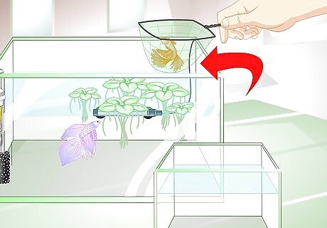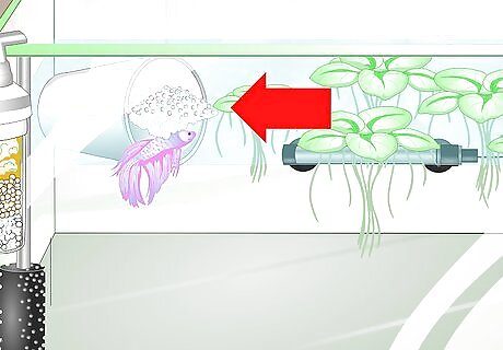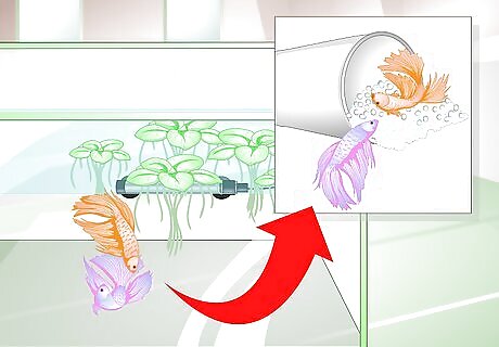 Arrange floating plants as hiding spots. Female bettas need places to hide to relieve stress and avoid injury. Plants can also help protect the bubble nest of eggs. Arrange a selection of floating plants in your tank to help ensure an optimal and protected place for your bettas to breed. You can use either live or artificial plants in the tank. Purchase plants at pet stores or retailers that specifically deal with fish.