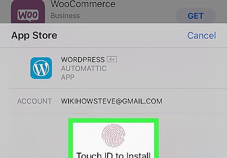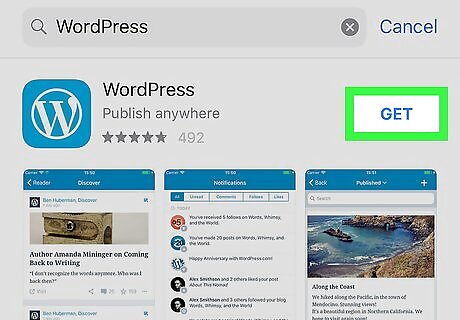 Tap the GET button next to WordPress. This will download and install the WordPress app on your iPhone or iPad. You'll have to confirm the install in a new pop-up window.