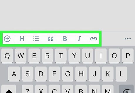 Write your blog post. Your blog's body is labeled "Share your story here" below the Title field. Tap here, and write your blog. Tap the "+" icon above the keyboard to insert an image from your gallery. Tap the "H" icon to stylize your text as a heading line. Tap the three lines icon to create a list in your post. Tap the quotation marks here to insert a quotation box. Use the "B" and "I" icons to write in bold or italics.