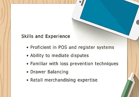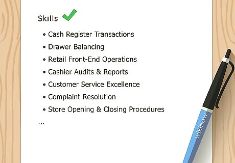 List both your skills and experience if you have mid-level experience. This is called a "combination" format. First, list a professional profile summarizing your qualifications. Next, make a skills section, listing relevant cashier abilities. Then, include your professional experience and education. The combination method focuses on your skills right away, rather than your experience. Employers will see your strengths with a combination of work experience and education. Mention things like busting a shoplifter, helping customers apply for credit cards, and signing customers up for rewards programs. Use this if you have 2-5 years of cashier experience.