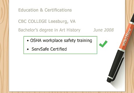 Include any cashier-related certifications. You can list these in your “Skills and Training” section. List any licenses or certificates related to your cashier duties. Write the name of the certificate or course and expiration dates. For example, mention certificates like ServSafe or OSHA workplace safety training.