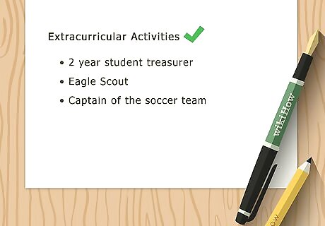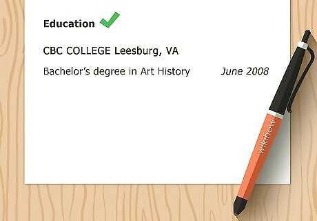 Detail your education history in a section titled “Education.” Write the name and location of your high school. Be sure to include college or technical school if applicable. Write the school name, dates attended, and area of study. Mention what kind of degree you have, like a Bachelor’s degree in business or an Associate’s degree in accounting.